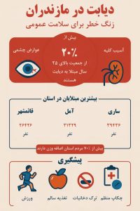 براساس داده های آماری دانشگاه علوم پزشکی و خدمات بهداشتی درمانی مازندران ،این استان از نظر میزان شیوع دیابت رتبه اول کشور را دارد و حدود ۲۰ درصد جمعیت بالای ۲۵ سال به این بیماری مبتلا هستند همچنین مازندران به دلیل دارا بودن رتبه دوم چاقی و اضافه وزن کشور رتبه ششم شیوع پیشدیابتی کشور دارد و ۲۹ درصد جمعیت بالای ۲۵ سال استان در معرض ابتلا به این بیماری در آینده قرار دارند.